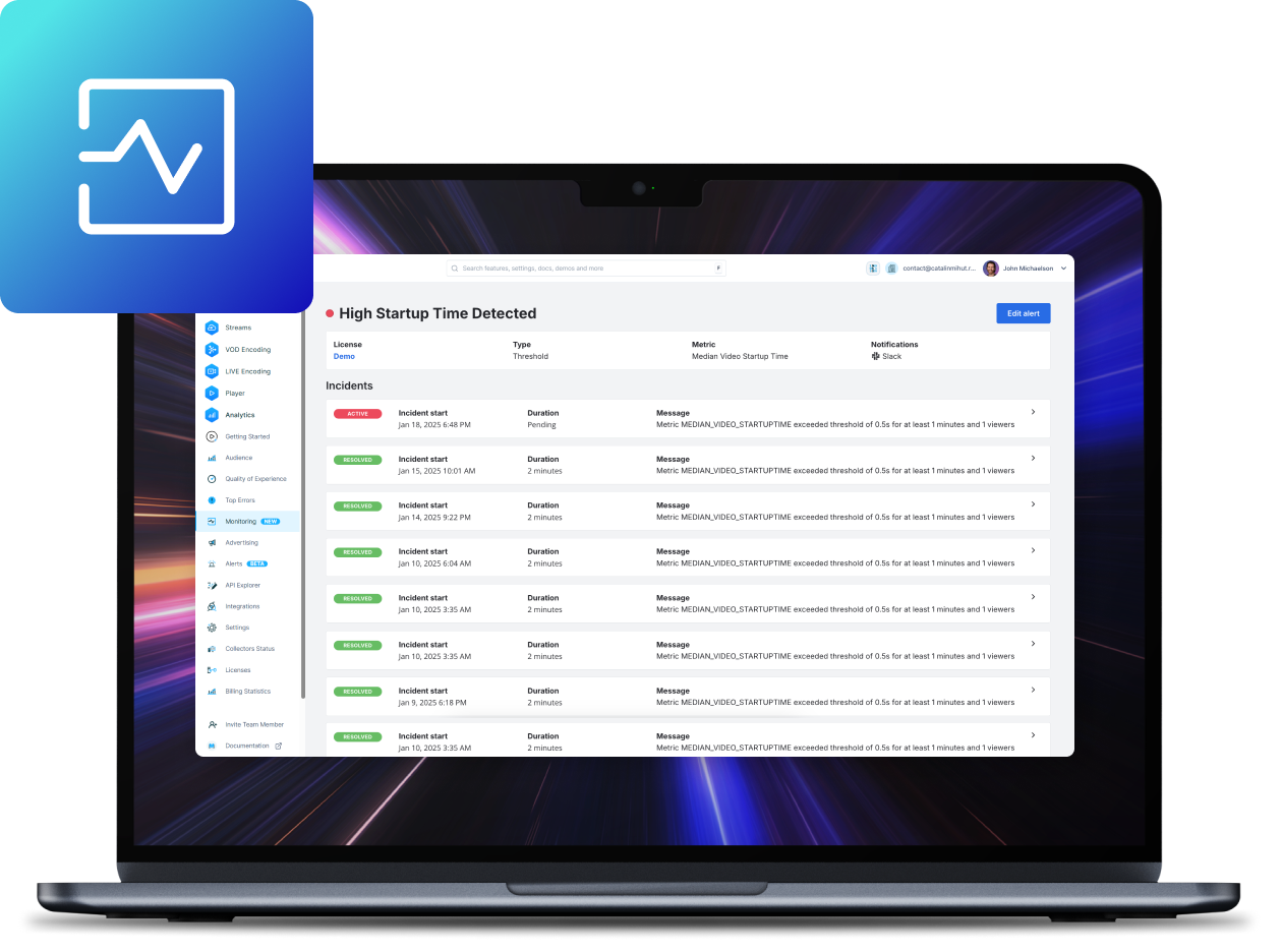 Originally a feature within Bitmovin Analytics, Bitmovin Observability has now been launched as a solution in its own right. Unlike general purpose observability platforms, it provides observability tailored for video playback. With its deep session-level insights, advanced error debugging,incidents screen with alerts and award winning monetization telemetry, the platform has been designed specifically for real-time monitoring, making it ideal for enterprise streaming services alongside high-profile events such as sports.