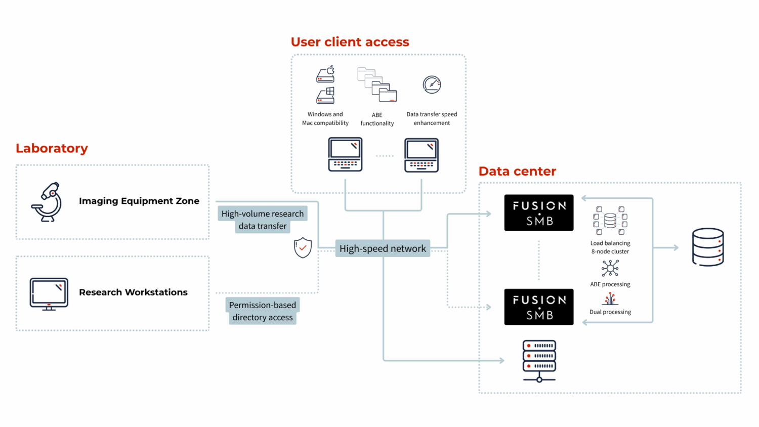 The medical school manages data from an extensive array of sophisticated imaging equipment, including Optical Coherence Tomography (OCT), Diffuse Optical Tomography (DOT), Super-resolution Microscopy, Raman Spectroscopy, Photoacoustic Imaging, Endoscopy, and X-ray systems. These devices generate ultra-high-resolution images and videos, requiring a robust system for storing and accessing research data. The institution needed a solution that could handle concurrent access to large reference files while maintaining data integrity and security.